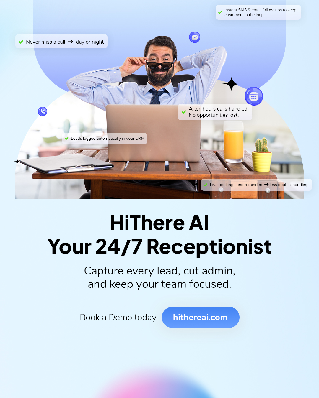 HiThere AI is a 24/7 AI-powered virtual receptionist for service-based businesses. It answers calls, qualifies leads, schedules appointments, and logs every interaction into your CRM. Built for industries such as trades, clinics, hospitality, and property management, it helps businesses operate smarter and provide professional customer experiences.